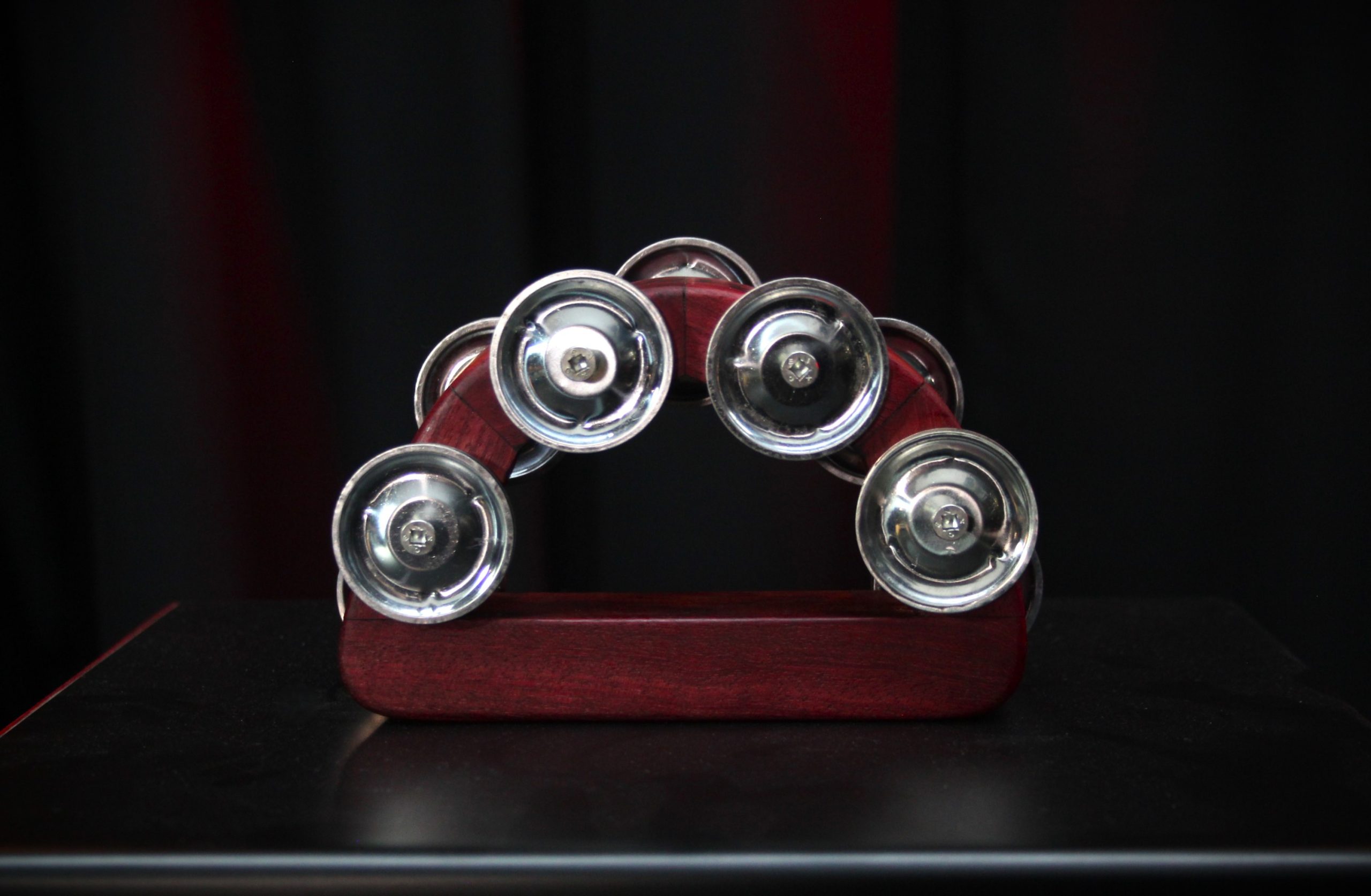 The Mom-E is a half moon or ‘D’ shaped handheld tambourine. It’s made of Purpleheart wood and is fitted with 5 sets of jingles on the top and 4 sets on the bottom. Beautiful handcrafted tambourines that cut through the mix in live performance or studio recording.