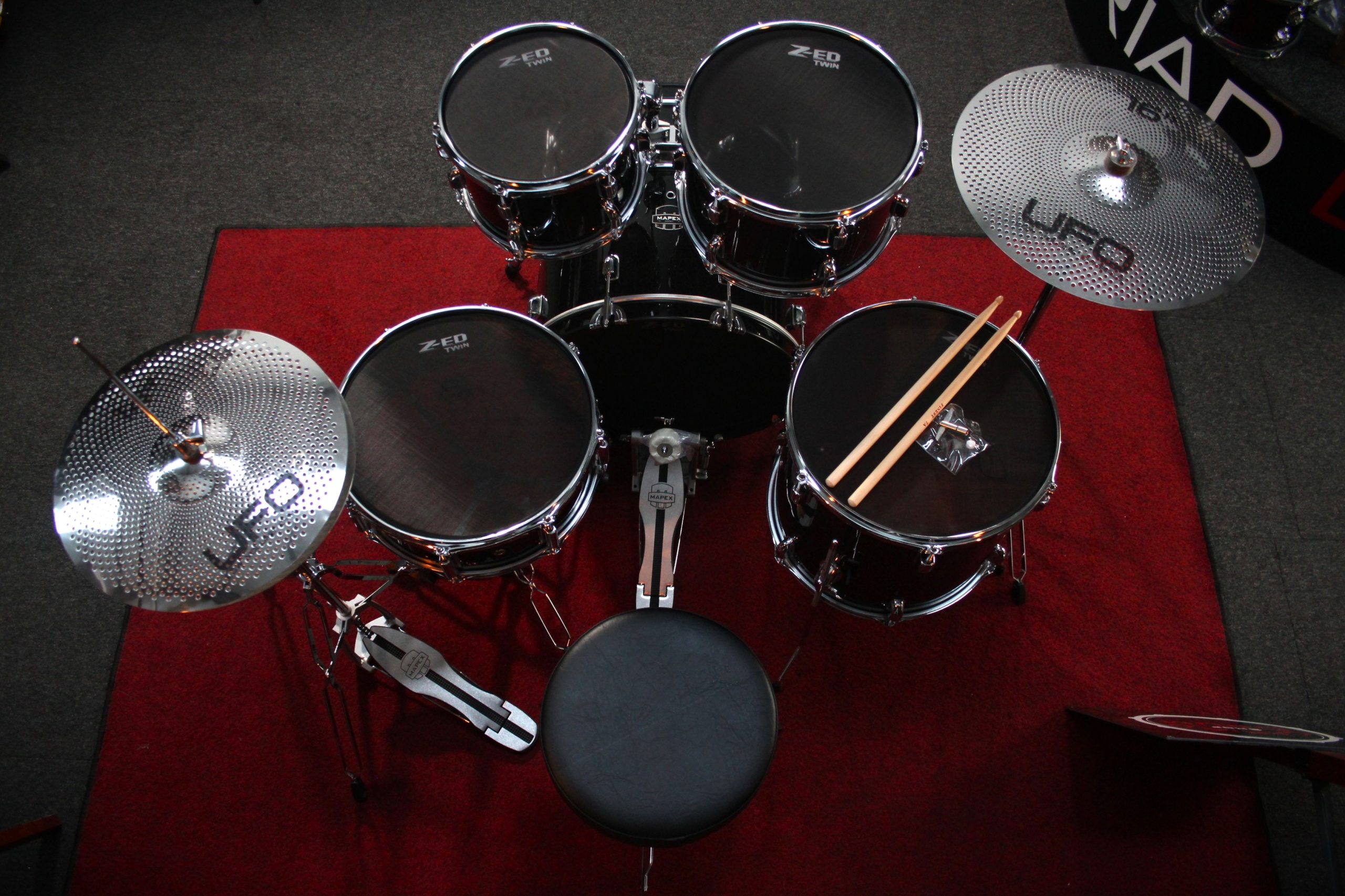 A Mapex Comet which has been converted in store into a Stealth kit, ideally suited as a practice kit and is guaranteed not to upset the neighbours. We carry out the conversion in store and supply you with the original heads and cymbals, so it can be converted back to a standard acoustic drum kit, if your neighbours will allow it!